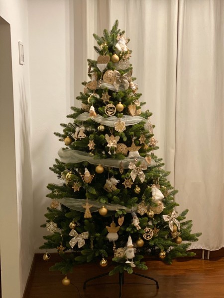 Tradičný vianočný stromček s drevenými ozdobami a prírodnými motívmi