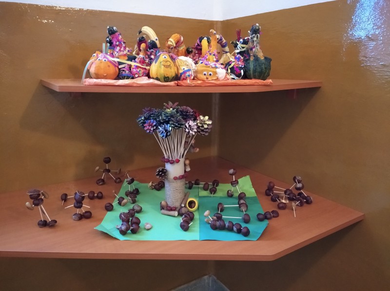 Výzdoba z jesenných plodov-veselé tekvice, zvieratká z gaštanov, farebné kvety zo šišiek